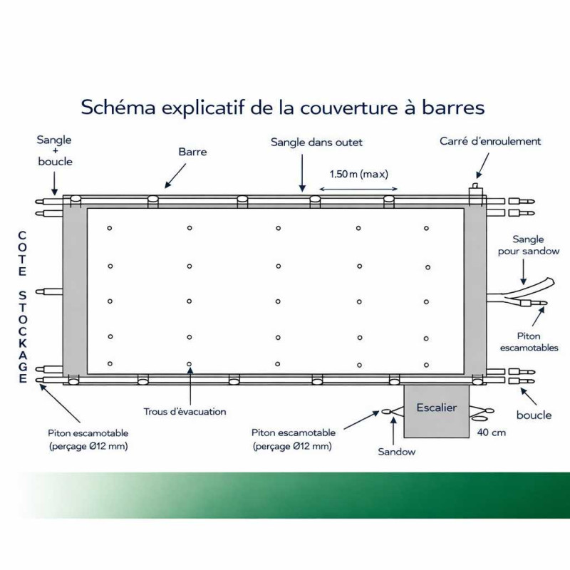 - Barres d'enroulement et de stockage intégrées dans les ourlets pour donner un maximum de tension à la couverture.