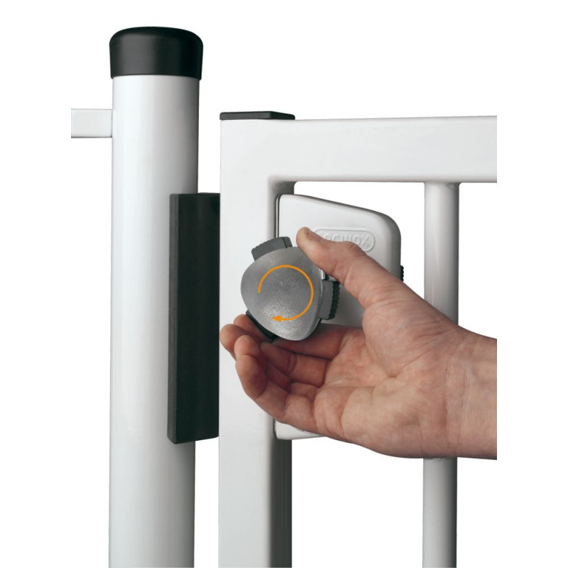 La serrure nécessite une double action mécanique pour ouvrir le portillon et respecte la norme NF P90-306 (1. appuyer sur le bouton, minimum 2 kg de pression / 2. tourner la poignée). Le barillet est fourni avec son jeu de clés. Les charnières en inox sont pourvues d'un système de retour automatique incorporé et réglable.