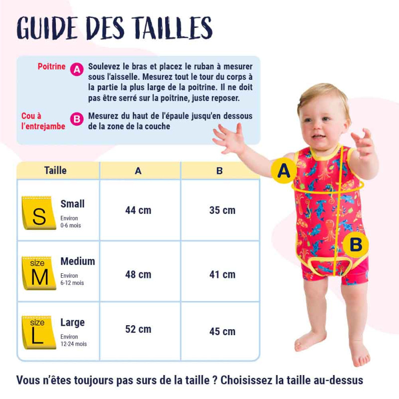 Pour faciliter le changement de votre bébé avant et après la baignade, ce maillot de bain bébé est doté d'un design plat et unique. Pour le mettre et l'enlever rapidement, il suffit de détacher les bandes velcro situées sur les épaules, le côté et l'entrejambe de la combinaison. Cela permet de rendre la combinaison de bain bebe totalement plate et de poser votre bébé dessus avant d'ajuster les bandes velcro pour un maintien parfait.Une fois votre baignade ou votre cours de natation terminé, il vous suffira de rincer la combinaison bébé à l'eau froide et de la laisser sécher à l'air libre. Grâce à la qualité de son matériau en néoprène, vous pouvez être sûr que la combinaison restera en excellent état même après plusieurs utilisations.N'oubliez pas de compléter l'équipement aquatique de votre bébé avec notre sélection de maillots de bain couche pour une protection optimale contre les fuites et les accidents dans l'eau.