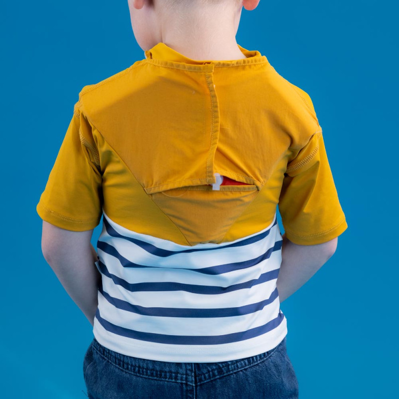 Doté d’une bouée, ce tee-shirt anti-noyade est conçu pour se gonfler en moins de 3 secondes en cas d’immersion. Grâce à la disposition stratégique de ses flotteurs, il va permettre de retourner l’enfant pour lui positionner la tête hors de l’eau en moins de 5 secondes, quelle que soit la position de la chute. Ce tee-shirt assure le maintien des voies respiratoires hors de l’eau, afin d’éviter une noyade.
